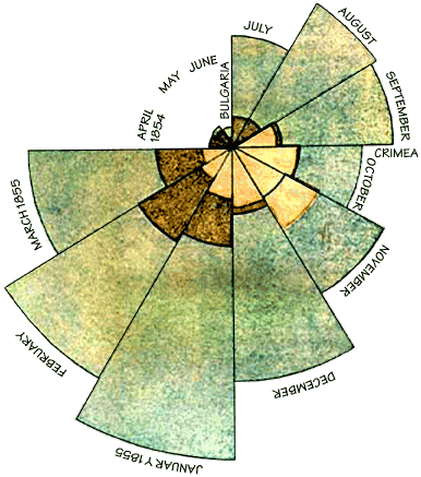 Florence Nightingale (1820-1910) er mest kendt for sit arbejde som sygeplejerske under Krimkrigen og som grundlægger af moderne sygepleje; kun de færreste véd, at hun også var en foregangskvinde inden for deskriptiv statistik, blandt andet ved at være en af de første, der benyttede grafiske metoder til at illustrere statistisk materiale.Som ung var hun blevet interesseret i matematik, men måtte kæmpe med forældrene for at få lov til at dyrke denne interesse, da det ikke blev anset for nyttigt for en giftefærdig kvinde at kunne matematik. Heller ikke hendes ønske om at blive sygeplejerske var det, hendes velhavende forældre havde forestillet sig. På den tid var det næsten kun fattige piger, der blev sygeplejersker og disse fik ikke nogen speciel uddannelse. Under Krimkrigen (1854-1856), hvor hun blev kendt som "the Lady with the Lamp", en mild engel, der opofrende trøstede og helbredte syge og sårede, indsamlede hun datamateriale om antal døde og dødsårsager. Hun bearbejdede dette materiale statistisk og fandt på en ny type diagram, der kunne illustrere frekvensen af forskellige dødsårsager måned for måned. En del af hendes diagram er vist nedenfor. Det minder om det, nogle kalder et lagkagediagram. Hvert stykke af kagen repræsenterer en måned og arealet af stykket er proportionalt med antallet af dødsfald den pågældende måned. De rødlige områder svarer til de dødsfald, der skyldtes sår efter kamp, de blågrønne områder yderst svarer til dødsfald på grund af kolera eller tyfus, og resten er dødsfald af andre årsager. Florence Nightingale brugte diagrammet til at overbevise hærledelsen om, at bedre sanitære forhold ville kunne reducere antallet af dødsfald betydeligt. |