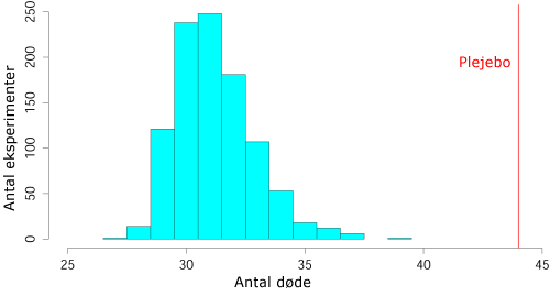 Dette eksperiment er gennemført 1.000 gange for p = 27/730, en sandsynlighed, der gør begge Plejebo25