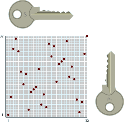 I de konventionelle systemer er der ingen principiel forskel på at kryptere og dekryptere. Kan man det ene, kan man også det andet. I Cæsars system krypteres ved at forskyde 3 pladser til højre i alfabetet - der dekrypteres ved at forskyde 3 pladser til venstre. I RSA-systemet er det ikke i praksis muligt at dekryptere en tekst, selvom man kender den nøgle (k,n ), der er brugt ved krypteringen. I dette system vælges n som et produkt af to primtal, og det er kun muligt at bestemme den nøgle (d,n ), der kan dekryptere, hvis man ved, hvilke to primtal n er dannet udfra. Det er nemt nok at opløse et tal n i primfaktorer ved at prøve sig frem, hvis n ikke er for stort, men for tal med 150 cifre bliver det en helt uoverkommelig opgave for selv de allerhurtigste computere. For den, som kender de to primtal, som n er produkt af, er det til gengæld ret let at beregne d, men fremgangsmåden er en teknisk detalje. En person kan altså selv konstruere en nøgle (k,n ) og offentliggøre den på for eksempel sin hjemmeside og bede om at vigtige meddelelser bliver krypterede med denne nøgle. Selv om en af disse meddelelser skulle blive opsnappet af en fjende, vil fjenden ikke kunne dekryptere den, da det kræver kendskab til nøglen (d,n ). I en sådan situation kaldes (k,n ) den offentlige nøgle, som også betegnes P (for public), mens (d,n ) kaldes den hemmelige nøgle, som betegnes S (for secret). De to nøgler ophæver hinanden forstået på den måde, at hvis man låser, det vil sige krypterer, med for eksempel den hemmelige nøgle, så kan man låse op, altså få den oprindelige tekst frem, med den offentlige nøgle. Den nøgle, der er brugt til at låse, kan ikke, i modsætning til en almindelig nøgle, låse op igen. Digital signaturDer kan også være behov for, at man som afsender af en meddelelse, ikke nødvendigvis hemmelig, kan godtgøre, at man virkelig er den, man giver sig ud for at være. Hvis man har en hemmelig nøgle S og en offentlig nøgle P, kan man sammen med den egentlige meddelelse sende en typisk kortere tekst H, dels i en ikke krypteret udgave, dels i en udgave S(H), der er kryp-teret med den hemmelige nøgle. Modtageren kan så bruge den påståede afsenders offentlige nøgle P på S(H) og se efter om man får H. Det er jo kun, hvis de to nøgler svarer til hinanden, at man får den oprindelige tekst H frem. Afsenderen kan på denne måde sætte sin underskrift på meddelelsen, sin digitale signatur. Hvor skal den enkelte bruger af et public-key system anbringe sin offentlige nøgle, således at de andre brugere har adgang til den og kan være sikre på, at den virkelig tilhører den person, som påstås at være ejermanden? I Danmark vandt TDC i 2003 Videnskabsministeriets udbudskonkurrence om Digital Signatur. Det betyder, at TDC registrerer offent-lige nøgler og garanterer for ejernes identitet. Når en bruger registreres udstedes et såkaldt personcertifikat, og aftalen mellem staten og TDC betyder, at disse certifikater er gratis, og at alle kan få et personcertifikat, uanset om man er kunde hos TDC eller ej. SikkerhedenSikkerheden i et public-key system bygger på, at man ikke kan dekryptere en meddelelse, selvom man kender krypteringsnøglen (k,n ). Man kan forestille sig, at en fjende ville kunne angribe systemet på en række forskellige måder. Man kan jo i princippet få den oprindelige tekst frem ved at løse ligninger af typen r = rest(xk,n) fx 5 = rest(x3,33) Det vil tage for lang tid bare at prøve sig frem ved at indsætte 1, 2 , … osv. som x, når n er tilstrækkelig stor. Der er heller ikke fundet mere avancerede brugbare søgningsmetoder, som ved almindelige ligninger, hvor man ved indsættelse af et gæt kan sammenligne venstresiden og højresiden og på den måde se, om man er i nærheden af en løsning. Det hænger sammen med at højresiden varierer så tilfældigt som vist på figuren.