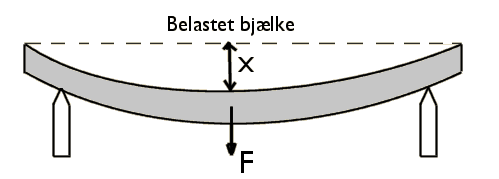 I kan fx lægge en snor rundt om stokken på midten og hænge lodder i den. Mål nedbøjningen, x, så præcist, som I kan for forskellige belastninger, F.