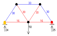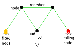 Nedenfor ses en simpel brokonstruktion, hvor belastning (load) og størrelsen af kræfterne er angivet. Røde led (member) er udsat for trækkræfter, mens blå led er udsat for trykkræfter.