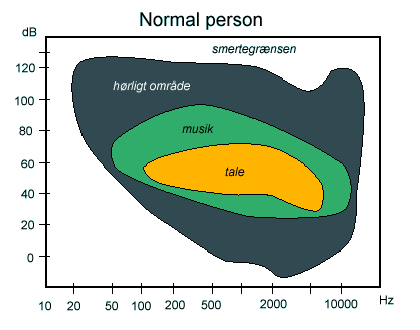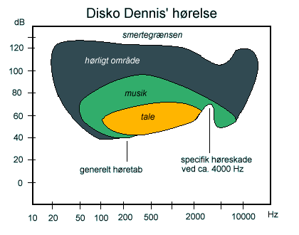 Dennis får nedsat hørelseLad os følge Dennis lidt endnu. Der sker typisk det, at hans walkman bliver dårligere og dårligere. I hvert fald skal den skrues mere og mere op, for at den kan give en bare nogenlunde anstændig lyd. Dennis har også lagt mærke til, at alle omkring ham er begyndt at tale så underligt. Det er ikke bare det, at de taler mere sagte. De taler ganske enkelt mere uforståeligt. Dennis er begyndt at udvikle nedsat hørelse. Efter flere opfordringer fra sin familie og sine venner opsøger han en hørespecialist for at få taget sit audiogram. Det er en kurve, der viser, hvor effektiv ens hørelse er ved forskellige frekvenser. Af audiogrammet ser man, hvordan Dennis' høretærskel er forhøjet: Der skal mere lydstyrke til, før han hører noget som helst.