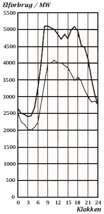 Elforbruget i Danmark varierer i dagens løb, og det er heller ikke det samme på de forskellige årstider. Det illustreres af grafen til højre, hvor den øverste kurve viser el-forbruget på en decemberdag, medens den nederste er fra samme ugedag i juni.