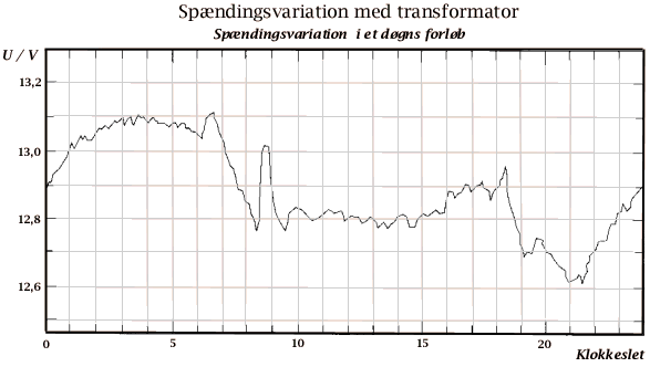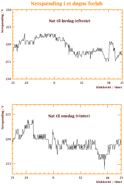 En direkte måling af netspændingen i løbet af et døgn på Nørrebro i København med start hhv. fredag kl. 21 (efterår) og onsdag kl. 21 (vinter) er vist nedenfor.