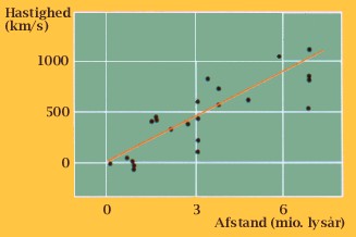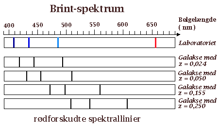 Spektrallinierne er systematisk forskudt mod den røde side af galaksernes spektre. Denne rødforskydning, z er større, desto fjernere galakser, der observeres. Her er kun vist forskydningen af brints mest karakteristiske linier. En sådan rødforskydning blev omgående fortolket som et udtryk for bevægelse bort fra os (bevægelse imod os ville give anledning til blåforskydning af linierne), helt som når en ambulances sirene skifter til et lavere toneleje ved forbikørslen. Den procentvise rødforskydning i forhold til hvileplaceringen i spektret er proportional med objektets hastighed bort fra os (og angiver faktisk hastigheden i forhold til lysets hastighed, 300.000 km/s). Så proportionaliteten mellem afstand og rødforskydning kan omsættes til en proportionalitet mellem afstand og hastighed i et såkaldt Hubble-diagram. Her skal man dog være opmærksom på, at afstandsbegrebet kun har mening for de nærmeste galakser jvf. afsnittet: „Problematiske afstande"