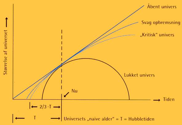Universets alderAf Jan Teuber, Senter for høyere studier, Oslo. Hvis universets udvidelse hele tiden havde foregået med samme fart, ville dets alder skulle angives som værdien af den tidligere omtalte Hubbletid. Men sådan forholder det sig ikke i virkeligheden. Udvidelsen modvirkes af den gensidige tyngdepåvirkning mellem galakserne. Og det betyder, at der hele tiden foregår en opbremsning. Nøjagtig hvor stor denne opbremsning har været, afhænger af, hvor meget stof universet indeholder. For tiden er det et meget aktivt forskningsområde at få fastlagt især mængden af stof, der ikke udsender lys det såkaldte mørke stof. Men under alle omstændigheder betyder en opbremsning, at universets alder er mindre end Hubbletiden.
