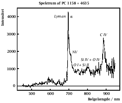 Spektret for kvasaren PC 1158 + 4635 er vist på figuren. Kvasarspektre har - i modsætning til normale galaksespektre - kraftige emissionslinier, der skyldes tilstedeværelsen af en eller anden meget kraftig energikilde. Denne kvasar har rekordstor rødforskydning. Man ser bl.a. den tydelige linie fra brint, Lyman-a linien, svarende til overgangen fra den 1. exciterede tilstand til grundtilstanden.