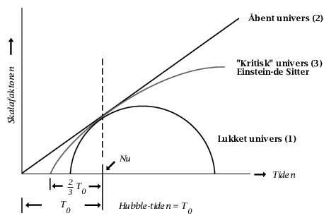 hvor k er en konstant. I opgave 3 fandt vi den såkaldte Hubble-tid, T0 = H0-1, som angiver en øvre grænse for universets alder, idet den bygger på antagelsen om, at universet har udvidet sig med samme konstante fart siden Big Bang. Denne antagelse må imidlertid være forkert, da gravitationskraften mellem galakserne får farten til at aftage. I Einstein-de Sitter modellen bremses universets udvidelse præcis så meget, at universet ikke trækker sig sammen igen. Se figuren.