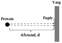 Sammenlign Planck-satellitten med dit eget øjes opløsningsevne: Tegn to lodrette streger på et stykke papir med 2 millimeters mellemrum og anbring papiret på væggen. Stil dig foran papiret, og gå nu baglæns, indtil du lige netop stadigvæk kan se to streger. Mål afstanden, d til papiret og beregn vinklen. (Se figuren).