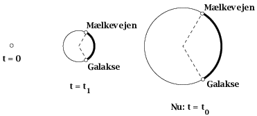 Vi går desuden ud fra, at rummets udvidelseshastighed har været konstant indtil i dag, hvor „radius" er 10 mia. lysår. Se figuren.