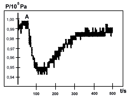 ![]() Forsøg 4: Trykket i en fryserDu har sikkert lagt mærke til, at det er svært at åbne lågen på en fryser, lige efter at den er blevet lukket. I dette forsøg vil vi studere fænomenet nærmere. I det følgende forudsættes derfor, at man har adgang til en skabsfryser udstyret med magnetlås. CBL-målingerMed CBL datalogningsudstyr tilkoblet en tryktransducer kan man måle trykket inde i fryseren. Man kan derefter via programmer til TI-83 eller TI-82 analysere disse målinger, og via Graflinkkabler til PC få tegnet grafer af de målte størrelser. På figuren ses et typisk trykforløb svarende til, at man åbner lågen ved A og hurtigt derefter lukker den igen.