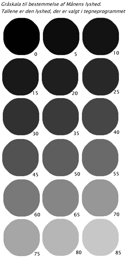 Bland sort og hvid farve i meget forskellige forhold og mal runde pletter, så du får en gråskala. Eller skriv denne gråskala ud på en god printer. Hvilken plet vil du tro, svarer bedst til Månens farve? Noter hvilken. Klip pletterne ud, så der ikke er hvidt omkring og find en lang, tynd, sort stang og noget klæbemasse.