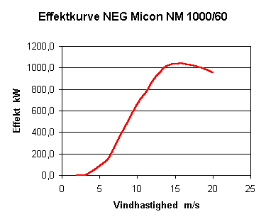 Effektkurve for NEG Micon 1000, der viser sammenhængen mellem vindhastighed og møllens producerede effekt..
