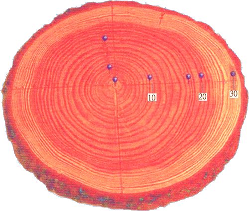 I år med tilpas varme og nedbør samt tilgængeligt næringsstof sker der en ekstra stor tilvækst, dvs. der bliver dannet en bredere årring. Tæl de mørke årringe. Hvis årringene ikke er lige brede, så er træet ikke vokset lige meget hvert år. Prøv som indledning at finde svar på følgende spørgsmål a) – e) ud fra dette billede: