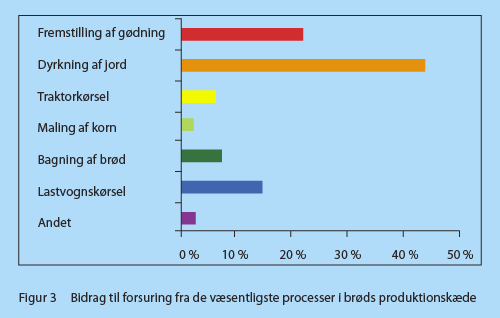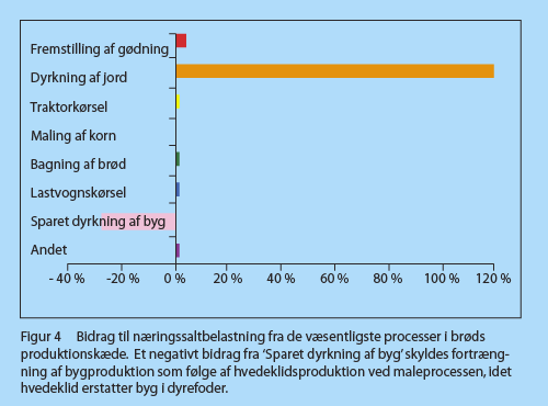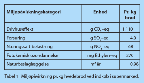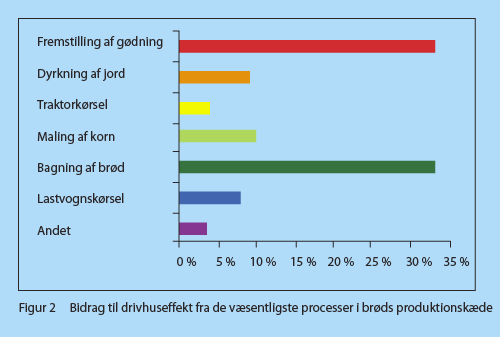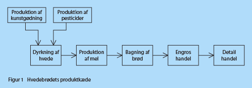 En skinke-sandwich består af hvedebrød og skinke. Hvedebrøds produktkæde er illustreret i figur 1 og miljøpåvirkningen i brøds produktkæde fremgår af figurerne 2–5. Alle opgørelser er pr. kg hvedebrød. Tabel 1 giver en samlet fremstilling af miljøpåvirkningen fra 1 kg hvedebrød.