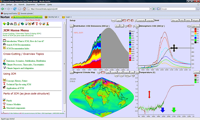 E23 – Vær klimaforsker for en dag På siden chooseclimate.org/jcm/jcm4/ (husk at have installeret JAVA) kan man køre en global klimasimulering med forskelligt input fra fx CO2. Man kan også se på IPCCs standardmodeller og gå i detalje med de forskellige output fra en sådan model. Modelleringsprogrammet har en forside der ser således ud: