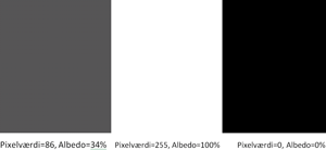 Herefter kan I som beskrevet nedenfor justere billedets lysstyrke og kontrast så referenceværdierne passer i billedet. Gøres dette, kan man direkte aflæse pixelværdien for den undersøgte overflade og finde albedo efter følgende forskrift: