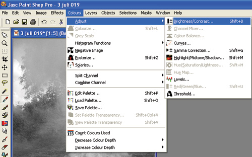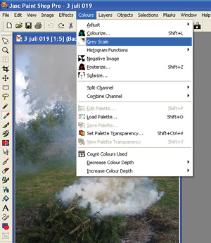 Fremgangsmåde Ved at benytte et digitalkamera skal I tage billeder af hhv. jord, vegetation, is og vand. Som beskrevet under teorien skal I sørge for at få referencekortet med på billedet. Vha. kablet overføres billederne til computer og nu skal I korrigere lyset og kontrasten på billedet, så værdierne på referencekortet passer. Til dette formål kan I benytte programmet Paint Shop Pro. Korrektion i Paint Shop Pro Først skal billedet lavet om til gråtoner. Dette gøres som vist til højre: