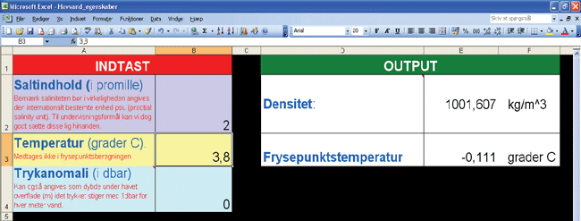 I skal nu se på sammenhængen mellem saltindhold og frysepunkt. Tegn i Excel en graf med saltindhold på x–aksen og frysepunktet på y–aksen. Prøv at lave en tendenslinie. Bestemmelse af en ukendt prøve: I får udleveret en ukendt saltopløsning, taget fra et sted i de danske farvande. Mål dens frysepunkt og brug jeres graf til at bestemme dens saltholdighed. I kan finde kort over saltholdigheden i de danske farvande her: ocean.dmi.dk/anim/index.html. Vælg ”saltholdighed, overflade” som parameter i menuen til venstre. Bemærk: Forskere angiver saltholdigheden i ”practical salianity unit” (psu). Med god tilnærmelse kan man antage at 1 psu = 0,1%. DiskussionHer skal i diskutere jeres resultater i forhold til jeres hypoteser. Stemmer resultaterne overens med jeres hypotese? I givet fald hvorfor ikke? På dette sted er det også vigtigt at I vurderer forsøgets metode samt resultater. Konklusion Her skal I kortfattet skrive, hvad I har fundet ud af. Perspektivering Hvilken betydning har jeres eksperiment i den ”virkelige verden”. Har det fx betydning for, hvor der dannes havis? |