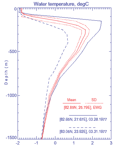 E14 – Illustration af ”Grønlandspumpen” Find selv på et forsøg, der illustrerer grønlandspumpen. Det kan være en god ide at benytte frugtfarve til at farve vandet. Du kan på forhånd undersøge densiteten for havvand ved hjælp af nedenstående excel-fil. Undersøgelse af havets lagdeling I det Arktiske Ocean mødes koldt vand med varmere vand, som kommer sydfra. I modsætning til hvad man skulle tro, lægger det varmeste vand sig ikke øverst! Som det kan ses på figuren er temperaturen i overfladen –1,8 °C, mens vandet i 200 m dybde er op mod +2,5 °C. Hvordan kan det være? Svaret ligger i, at densiteten (massefylden) af havvand afhænger af både temperaturen og saltindholdet. Det varmere vand i 200 meters dybde må altså være mere salt. Du kan forsøge at undersøge sammenhængen mellem massefylde, saltindhold og temperatur i Excel-arket du kan downloade her. Her kan du også få svar på, hvordan det kan være, at temperaturen af vandet i overfladen kan være under 0 °C. Forsøg om I kan genskabe en lagdeling med det kolde vand øverst! Farv den vandmasse som er lettest. I kan evt. forsøge forsigtigt at måle temperaturen ned gennem vandsøjlen med et elektronisk termometer (helst en lille termoføler med dataopsamling).