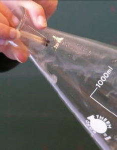 Behandling af resultater Tegn en graf, der viser densiteten som funktion af saltprocenten. Aflæs på grafen havvandets saltprocent ved at se, hvilken saltprocent der svarer til den fundne densitet. Er der nogle fejlkilder ved metode 2? 3. Bestemmelse af saltindholdet i havvand ved fældningstitrering Metode Titrering En portion havvand tilsættes en sølvnitratopløsning fra en burette. De tilsatte sølvioner reagerer med chlorid-ionerne. Ved hjælp af en passende indikator kan man se, når alle chloridionerne i saltopløsningen har reageret med sølvionerne. Man aflæser det tilsatte volumen sølvnitrat på buretten. Teori Når man tilsætter sølvnitrat til saltvand, dannes det tungtopløselige sølvchlorid: Ag+ (aq) + Cl–(aq) → AgCl (s)Natriumchloridopløsningen er tilsat en indikator, der indeholder de gule chromationer CrO42– (aq). 2Ag+ (aq) + CrO42–(aq) → Ag2CrO4 (s) Når man kan se en svag blivende rødfarvning ved tilsætning af én dråbe, stoppes titreringen, og volumen af forbrugt sølvnitrat aflæses på buretten. Apparatur 5 mL fuldpipette, burette, stativ med klemme, 250 mL konisk kolbe. Opløsninger: 0,05 M sølvnitrat, 10% kaliumchromatopløsning (indikator), vandprøver af havvand, saltopløsninger med 0,5 %, 1%, 2%, 3 % og 4 % salt. Fremgangsmåde Afpipettér præcis 5 mL saltopløsning/havvand i en 100 mL bægerglas under magnetomrøring. Resultater