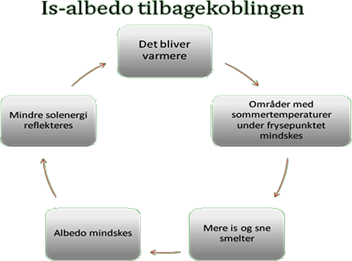 O12 – Undersøg en selvforstærkende tilbagekobling - positiv tilbagekobling Om tilbagekoblinger: Som beskrevet i teksten findes der en række tilbagekoblinger i klimasystemtet. Der er tilbagekoblinger, der virker stabiliserende på temperaturen (negativ tilbagekobling), som gør det vanskeligere at ændre middeltemperaturen på Jorden. Omvendt er der også tilbagekoblinger, der virker selvforstærkende (positiv tilbagekobling), hvilket betyder, at det bliver lettere at ændre klimaet, da selv små ændringer forstærkes. I teksten nævnes is-albedo tilbagekoblingen som et eksempel på en selvforstærkende (positiv) tilbagekobling. Den er skitseret nedenfor.
