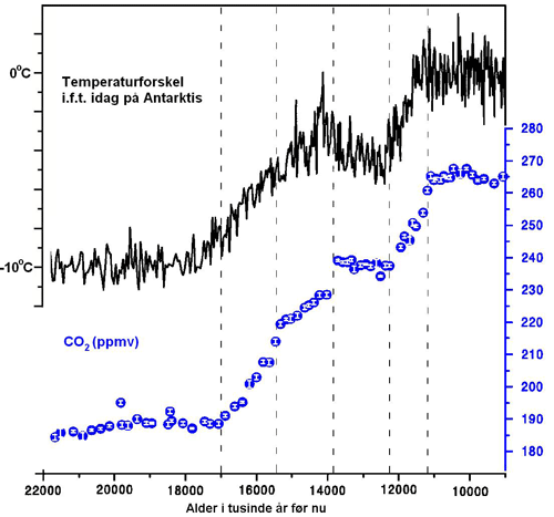 Man regner generelt med, at temperaturen på Antarktis begynder at stige ca. 800 år før CO2–indholdet i ved de sidste istiders afslutning.