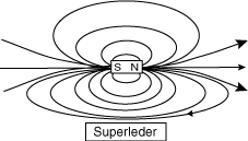 Evig strømEn superstrøm vil blive ved med at løbe helt af sig selv i al evighed, når den først er sat i gang! Dette er helt modsat normale strømme i almindelige ledere: Her skal strømmen hele tiden drives af sted af en spændingskilde, som tilfører de strømmende ladninger energi, der opvejer tabet til lederen. Hvis man slukker for spændingskilden, går strømmen i en almindelig leder omgående i stå! Frastødning af magnetfelterSuperledere "frastøder" ydre magnetfelter. På figur 1 er en stangmagnet anbragt over en superleder. I superlederens overflade induceres superstrømme, som skaber et modsat rettet magnetfelt, der er lige så stort som feltet fra den ydre magnet. Således vil det samlede magnetfelt overalt inde i superlederen blive nul! Dette er den såkaldte Meissner-effekt. Da magnetfeltlinier altid er lukkede kurver, vil der uden for superlederen være feltlinier, der "løber tilbage". De forløber næsten som om de kom fra en magnet helt magen til den ydre magnet, men placeret i dens "spejl-billede" under superlederens overflade. Disse to magneter (den rigtige og "spejlbilledet") vil frastøde hinanden, da nordpol ligger over nordpol og sydpol over sydpol. Hvis man slipper magneten vil den svæve over superlederen!