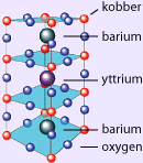 Figur 3. En vigtig egenskab ved keramiske superledere er tilstedeværelsen af planer, hvor oxygen og kobber er kemisk bundet til hinanden. Kuglemodellen viser YBa2Cu3O7. |