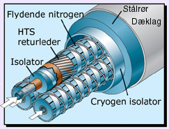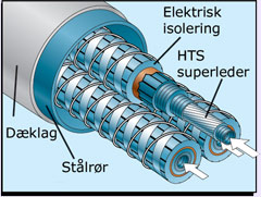 Superledende kablerVed fremstilling af superledende kabler skal der tages hensyn til mange ting, bl.a. fremstillingsprisen og driftsomkostningerne ved brug af kablet. Det er først og fremmest udgifter til køling. Da flydende nitrogen er langt billigere end flydende helium, er man nødt til at bruge de meget sprøde keramiske superledere, der kan køles med nitrogen. Det er ikke helt let at fremstille et bøjeligt kabel med en keramisk leder, uden at den går i stykker. Man har klaret problemet ved at fylde et rør af sølv med det superledende stof på pulverform. Røret udvalses til meget mindre dimensioner, hvorefter en række udvalsede rør anbringes i et nyt sølvrør, som udvalses til et langt, tyndt, fladt bånd, hvor de enkelte superleder-korn ligger tæt ved hinanden og holdes sammen af sølvet. Strømmen kan så løbe fra korn til korn ad den vej, der giver mindst modstand. Der er selvfølgelig mange steder, hvor der ikke er god forbindelse, og de bidrager ikke til ladningstransporten. KabeltyperDer findes to typer superledende kabler. Man kan enten lægge varmeisoleringen inde omkring superlederen og den elektriske isolering og den skærmende leder udenpå, eller også kan man lægge både den elektriske isolering og en superledende skærm inderst og varmeisoleringen udenpå. Den første type, RTD (room temperature dielektric), består af et fleksibelt rør til den flydende nitrogen. Udenom er viklet et lag af superledende bånd og varmeisolering, herpå en elektrisk isolator (et dielektrikum), en skærm og armering, se figur 6. Denne type anvender en velkendt type dielektrikum og har et lavt varmetab. Til gengæld er der et elektrisk felt uden om kablet, og det har en begrænset strømstyrke. I den anden type, CD (cryogen dielectric), lægges et elektrisk isolerende lag udenpå superlederen og derpå en superledende skærm efterfulgt af et varmeisolerende lag, se figur 7. Fordelen ved denne konstruktion er, at der ikke er en øvre grænse for strømstyrken, og at der ikke er noget ydre elektrisk felt, så det er muligt at anbringe kablerne til 3 faser tæt sammen. Ulemperne er en mere kompliceret konstruktion med to lag superledere, hvilket øger fremstillingsprisen, og dertil kommer et større varmetab. |