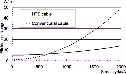 Opgave 6Energitab i elkablerDer er især to kilder til energitab i et superledende kabel. Som nævnt i opgave 5: Køling af et superledende kabel, medfører energitabet, at der skal tilføres energi til en kølemaskine. Det største tab sker i form af varmeenergi, da det ikke er muligt at lave en perfekt varmeisolering af kablet. Temperaturforskellen mellem omgivelserne, ved stuetemperatur, og det superledende kabel, ved 77 K, medfører en tilførsel af energi i form af varme fra omgivelserne. Derudover tabes der energi i form af såkaldt AC-tab. Når kablet bruges til at transmittere vekselstrøm, afsættes der energi i lederen. Dette skyldes især, at der samtidig induceres et varierende magnetfelt i lederen, og ved hver ændring af magnetfeltet afsættes der varmeenergi i lederen. En tilsvarende mekanisme er årsag til, at der afsættes energi i den metalliske indkapsling.