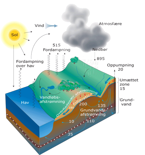 Grundvandet dannes om vinterenI Danmark vil den største del af nedbøren, der falder fra maj til september, opfanges af vegetationen; enten på blade og grene eller af rødder i den øverste meter af jorden. Ved fordampning afgives vandmolekyler til luften, og her kan de nu med vinden føres tilbage til atmosfæren og på ny indgå i de små dråber, som danner skyerne.