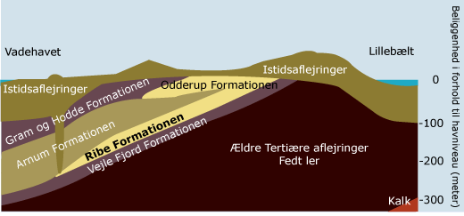 Området er en del af Nordsøbassinet, som synker ganske langsomt. Efter aflejringen af Ribeformationen kunne tilførslen af sediment ikke holde trit med nedsynkningens hastighed. Derfor rykkede kysten mod øst, og fint materiale fra havet blev aflejret oven på sandet. Under istiden blev de øverste lag eroderet, men isen og smeltevandet lagde også nye lag ovenpå. Grundvandet, der strømmer i Ribeformationen, dannes ved nedsivning gennem sandlag nær den jyske højderyg. Derefter siver det lige så langsomt mod Vesterhavet. Her presses vandet op, men opsivningen foregår vanskeligt, fordi der de fleste steder ligger tykke lag af ler mellem sandet og overfladen. Visse steder er der dog små ”vinduer”, og her kan vandet langsomt sive op. På grund af dette ”flaskehalsproblem” er vandet i Ribe-formationen meget gammelt, mere end 1000 år. Så her vil der gå lang tid, inden vi ser sporene efter menneskets nuværende påvirkning. Til gengæld tager det også lang tid at rette op på eventuelle skader, som bliver forvoldt på grundvandet. |