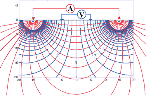I strømkredsløbet (rød farve) sendes 10 mA ud i et jordlegeme med resistiviteten 50 Wm. Niveaukurver for spændingen er angivet med afstand på 1 mV (blå farve). Vi ser, at der mellem elektroderne måles en spænding på 8 mV. Denne spænding er proportional med jordlegemets resistivitet. På den måde måler man, hvor god jorden er til at lede strømmen, der primært løber den direkte vej mellem elektroderne, men også i en bue ned til halvdelen af afstanden mellem elektroderne. Ved at flytte disse fire elektroder til andre steder på jordoverfladen kan vi med spændingsmålingen bestemme undergrundens resistivitet disse steder.