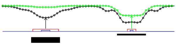 En 4-pols-måling med stor elektrodeafstand til venstre, og en 4-pols-måling med lille afstand til højre. Det dybe legeme (det sorte rektangel) ses kun ved den store afstand mellem polerne. Ved at flytte 4-pols-opstillingen i små trin langs en linie på jordens overflade afslører vi forskellene under linien. Figuren ovenfor viser, hvordan 100 målinger med en lille afstand mellem strømelektroderne afslører et lerlegeme nær overfladen, men overser et lerlegeme dybere nede. Dette dybere lerlegeme finder vi imidlertid klart og tydeligt ved at øge afstanden mellem strømelektroderne. Jo større afstanden er mellem elektroderne, jo større indtrængningsdybde har den gennemsnitsmåling, vi foretager. Ved at benytte mange forskellige afstande mellem elektroderne, samt benytte avancerede computerprogrammer, kan man foretage en egentlig scanning af et dybdesnit i jorden. |