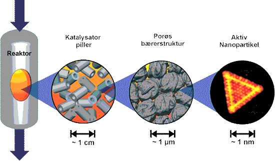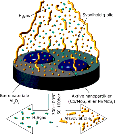 En typisk såkaldt heterogen katalysator består af meget små aktive nanopartikler med en diameter på 10100 nm, der sidder fordelt på overfladen af et bæremateriale med et meget stort overfladeareal. På den måde skabes der en enorm kontaktflade mellem de aktive partikler og reagerende gasser eller væsker. Et gram af en katalysator kan have et areal i størrelsesordenen af flere parcelhusgrunde! Reaktionsbetingelserne komplicerer tingene endnu mere, idet katalytiske processer typisk foregår ved en høj temperatur og ofte også ved et tryk på mange atmosfære. Forskningen i nanoteknologi er nu begyndt at ændre måden, som nye katalysatorer udvikles på, bl.a. baseret på viden skabt ved iNANO, Aarhus Universitet. En forudsætning for at kunne skræddersy en ny katalysator er evnen til at styre, hvordan reaktanterne først splittes og derefter samles til nye produkter på katalysatorens overflade. Da nanoteknologi netop handler om at kunne kontrollere materialer og molekyler på nanometerskala forventes det, at indsatsen inden for nanovidenskab vil give anledning til en markant hurtigere udvikling af bedre katalysatorer i fremtiden. Ved iNANO er der blevet opbygget en række unikke faciliteter til studier af katalysatorer. Med et hjemmebygget Skanning Tunnel Mikroskop (STM) kan man direkte afbilde, hvordan en katalysator er sammensat atom for atom og i nogle tilfælde direkte observere de enkelte trin i de kemiske reaktioner. Dette har givet en unik indsigt i katalysatorers virkemåde, specielt i den atomare struktur af den katalysator, der bruges til at fjerne svovl fra råolie, se boks. Løsningen på mange aktuelle energi- og miljømæssige problemstillinger afhænger i høj grad af, om det lykkes at udvikle bedre katalysatorer. Konkrete anvendelser til bl.a. reduktion af forureningen fra biler og kraftværker samt udviklingen af alternativer til benzin og diesel som brændstof til transport kræver en markant forøgelse af en række katalysatorers effektivitet. Studiet af afsvovlingskatalysatoren er et eksempel på, hvordan de redskaber og den viden, der skabes inden for nanoteknologien direkte kan anvendes til at studere modelsystemer for en kompleks katalysator. Det er lykkedes for den danske katalysatorproducent Haldor Topsøe A/S at videreudvikle afsvovlingskatalysatoren direkte på baggrund af den detaljerede indsigt, der er opnået med STM. Dermed er der skabt en ny generation af mere effektive afsvovlingskatalysatorer, der kan opfylde fremtidens miljøkrav. Myndighederne i EU og USA har for nylig besluttet at reducere miljøbelastningen fra afbrænding af restsvovl i diesel. Råolie indeholder en lang række urenheder, som af praktiske såvel som miljømæssige hensyn skal fjernes, før olien raffineres til benzin, diesel og andre olieprodukter. Specielt har indholdet af svovl i råolie fået meget opmærksomhed, idet afbrændingen af olieprodukter med svovl i sidste ende giver anledning til syreregn, forsuring af vandløb og søer og udbredt skovdød.