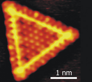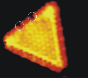 Alt dette er aldrig før blevet observeret direkte på en atomar skala, men Skanning Tunnel Mikroskopet (STM) har ændret ved dette. Ved iNANO er det lykkedes at skabe en realistisk model af katalysatoren i laboratoriet og på kontrolleret vis studere dens atomare opbygning og katalytiske aktivitet med STM. De aktive nanopartikler i afsvovlingskatalysatoren består hovedsageligt af molybdændisulfid (MoS2). Ved at fordampe metallisk molybdæn på en guldoverflade under tilførsel af svovlbrinte (H2S) lykkedes det at danne MoS2 nanopartikler med en karakteristik og størrelse lig nanopartiklerne i afsvovlingskatalysatoren. Figur 13 viser et atomart opløst STM billede af en ca. 3 nm bred MoS2 nanopartikel. STM billederne af de trekantede nanopartikler afslører adskillige overraskelser, bl.a. at MoS2-nanopartiklerne antager en trekantet form i stedet for en sekskant, som man ville forvente fra krystalstrukturen af MoS2. Denne viden har stor indflydelse på forståelsen af katalysatorens virkemåde. Kun kanterne af partiklen er reaktive, og kanterne på en trekantet og en sekskantet partikel er strukturelt forskellige. Katalysatoren er dog, som den er vist i figur 13, ikke katalytisk aktiv endnu. Den skal først aktiveres ved, at brintmolekyler ledes hen over den. Herved bliver der dannet svovlbrinte (H2S) og der bliver efterladt en tom plads, en såkaldt svovlvakance, som man mener er det aktive center i katalysatoren.