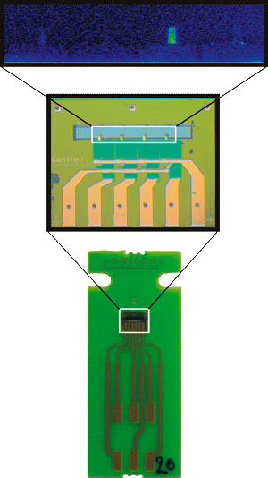 Cantion A/SCantion A/S blev etableret i 2001 på en ide udviklet på MIC institut for mikro- og nanoteknologi. Ideen går ud på at benytte de såkaldte bioprober med piezoresistiv udlæsning til hurtig og markørfri detektion af specifikke molekyler. Et sådant sensorsystem har mulige anvendelser inden for human diagnostik, fødevarekontrol, vandkontrol og sporing af sprængstoffer. Cantion A/S udvikler og fremstiller de små bjælkebaserede sensorer i silicium. Sensorne ætses ud lag for lag i en siliciumskive, der er cirka 0,5 mm tyk. På en siliciumskive med en diameter på 10 cm kan der være flere hundrede sensorer. Cantion A/S bruger meget energi på at optimere sensoren, så følsomheden kan blive så høj som overhovedet muligt. Man kan sige, at den oprindelige ide og den første demonstrationsmodel blev udviklet på MIC, hvorefter den egentlige produktmodning nu foregår i Cantion A/S. I produktmodningen er det vigtigt at udvikle en sikker og robust femstillingsmetode samtidig med at sensorens design optimeres. I denne optimering er det essentielt at optimere signal/støj forholdet. Hver enkelt sensor bliver monteret på et keramisk substrat, således at brugeren nemt kan håndtere sensoren og få elektrisk kontakt til den. Den færdigmonterede sensor placeres i en såkaldt C-boks, der måler de elektriske signaler fra fire bjælker samtidigt. Ved at registrere ubøjningen af fire bjælker er det muligt at undersøge fire forskellige reaktioner parallelt. Bjælkerne sidder kun et hårs bredde fra hinanden og det er derfor en udfordring at få de små bjælker belagt med forskellige detektorlag, der kan genkende forskellige molekyler. Derfor har Cantion A/S udviklet et apparat, CantiSpot, der kan ’spotte’ en lille dråbe væske på en enkelt bjælke. Hermed er det muligt at coate i princippet hundredvis af bjælker med forskellige væsker, indeholdende for eksempel forskellige DNA strenge. Cantion er for øjeblikket i gang med at sende de første produkter på markedet og henvender sig i første omgang primært til forskere. |