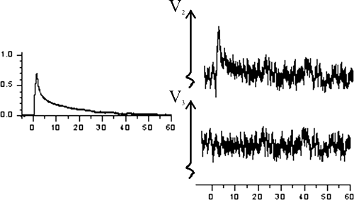 Kurven nedenfor til venstre viser udgangsspændingen i mV som funktion af tiden i sekunder efter at væsken med CRP er tilført.