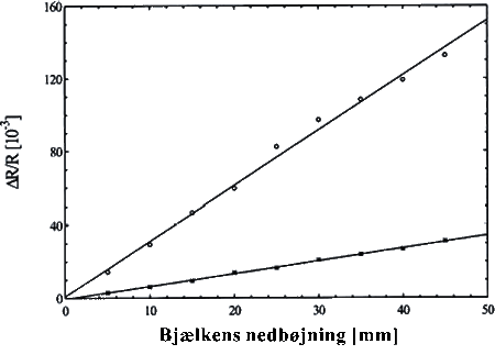 Grafen viser den relative ændring af resistansen som funktion af bjælkens nedbøjning.