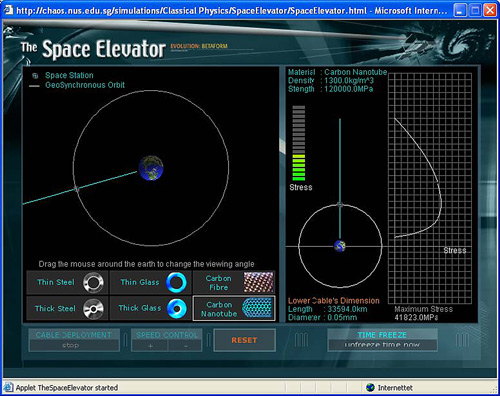 Vælg et materiale, fx stål, og klik på start. Langsomt begynder kablet at krybe ind mod Jorden, men knækker før det når helt derned.