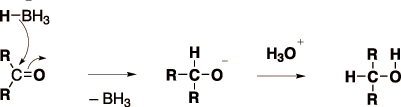 Reduktion af en keton til en sekundær alkohol bruttoreaktionsskema. Som reduktionsmiddel kan NaBH4 anvendes. Reaktionen sker trinvist. Først angriber BH4 carbonyl-carbonatomet, senere tilsættes syre, hvorpå oxygenatomet optager en proton.