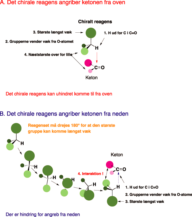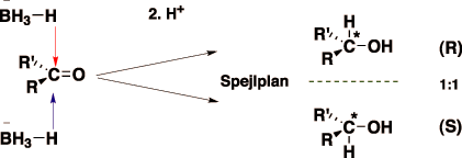Reduktion af en keton til en sekundær alkohol rumligt forløb. I biologiske reaktioner vil der ofte være en klar preference for R-formen eller S-formen. Hvis man fremstiller et lægemiddel, der indeholder en chiral sekundær alkohol, vil der derfor normalt være stor forskel på R- og S-formens virkning. I nogle tilfælde kan den ene form være et effektivt lægemiddel, mens den anden form kan være giftig, fordi den indgår i uønskede biologiske processer (se Chirale former). Hvis der i stedet for NaBH4 anvendes et chiralt reduktionsmiddel som fx CBS, vil de to spejlbilledisomerer ikke længere dannes i forholdet 1:1. Man får en stereoselektiv reaktion. I CBS er boratomet omgivet af fire forskellige substituenter og vil derfor være stereogent, ligesom et C-atom med 4 forskellige substituenter er det. På figuren ses, hvorfor sandsynligheden for angreb fra den ene side er større end fra den anden side.