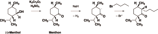 Brombutanen vil angribe anionen fra den side, hvor det er lettest at komme til. Det er nedefra, da nabomethylgruppen vender opad og skærmer oversiden.Der dannes således kun en stereoisomer. Vi har igen fået en stereoselektiv syntese, hvor chiraliteten igen stammer fra naturen. Produktet kan reageres videre til vigtige chirale lægemiddelstoffer.
