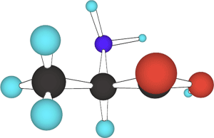 Fig. 3 er et endnu mere naturtro 3D-billede af alanin. Her er atomerne afbildet i naturlig størrelsesforhold, hvilket skjuler selve bindingerne. Man får en kalotmodel: