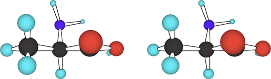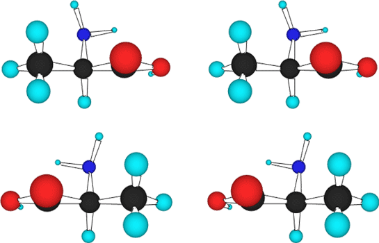 3D-Billederne sf de to spejlbilledisomere er vist neden for med (R)-alanin som det øverste billedpar og (S)-formen som det nederste billedpar: