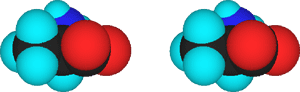 Dette ses endnu tydeligere ved at sammenligne 3D-billederne. Hvis 3D-billedet af (R)-alanin drejes 180 ° om en lodret akse, vil både syregrupperne og CH3-grupperne dække hinanden i (R) og (S)-strukturerne. Imidlertid vil NH2-gruppen vende nedad i (R)-strukturen og vil ikkie dække den opadvendende NH2-gruppe i (S)-strukturen: