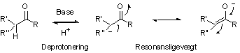 Hydrogenatomer på C-atomer ved siden af carbonylgrupper er (meget svagt) sure (pKs = 20). Dette skyldes, at fraspaltning af en proton giver en anion, der er relativt stabil, fordi dens negative ladning kan fordeles på (delokaliseres over) to atomer. Dette ses ved at bruge krumme pile til at vise, hvordan den negative ladnings elektronpar kan flytte sig fra C til O og tilbage igen.