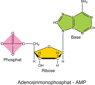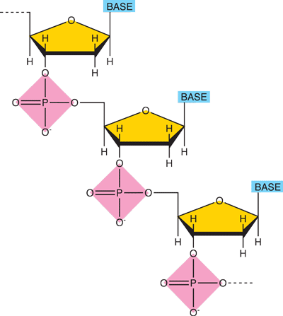 Figur 3. Phosphat og ribose danner skiftevis de lange kæder i DNA, hvorpå baserne sidder. Menneskets DNA består af DNA-kæder, der tilsammen er ca. 3.000.000.000 nucleotider lange. Alle pattedyrs DNA har omtrent samme størrelse, mens fx størrelsen af en bananflues DNA ”kun” er 180.000.000 nucleotider. Størrelsen af bakteriers DNA kan variere, men et gennemsnit er ca. 4.000.000 nucleotider. |