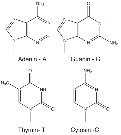 Figur 1. Der findes fire forskellige ”baser”, Adenin (A), Thymin (T), Guanin (G) og Cytosin (C), se figur 2.
